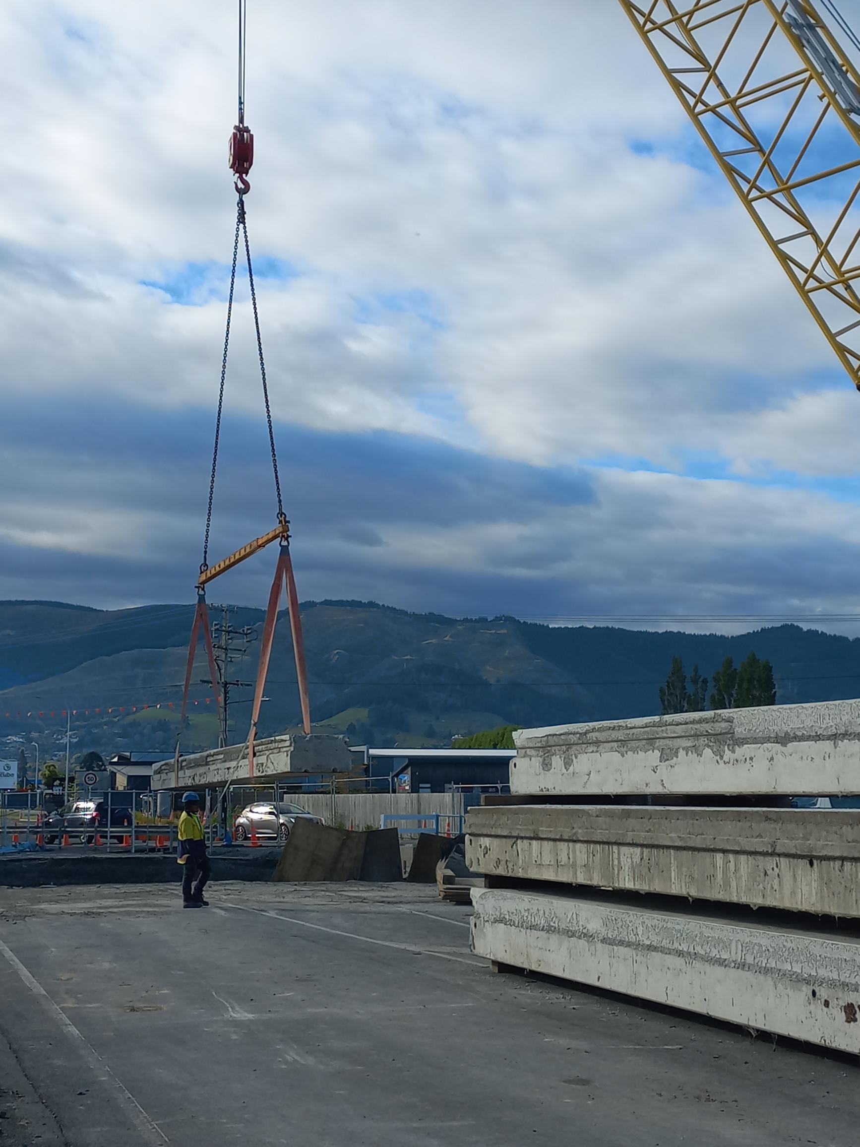 Our main contractor, Fulton Hogan, is bringing a 250-tonne crawler crane onto site by nine trucks and will be erected on an especially strengthened pad. (Picture on next page)