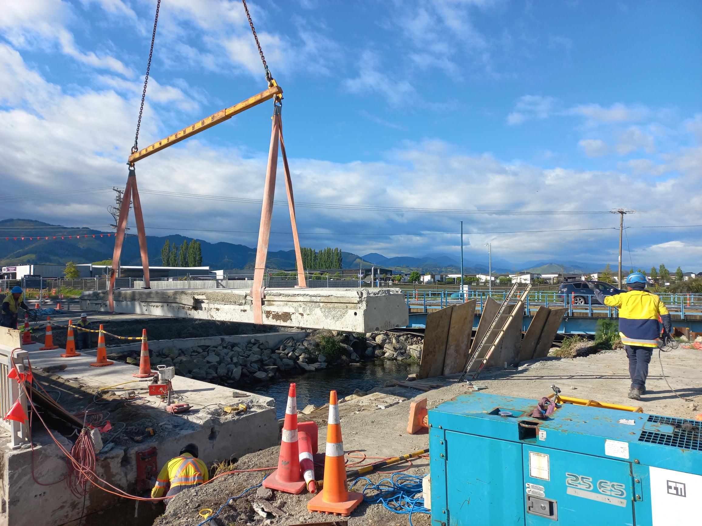 The project is progressing well with the old bridge demolished and pile driving for the new structure underway.