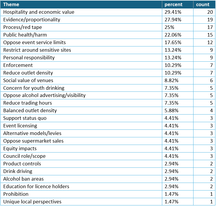 We received 68 responses, which informed a thematic analysis. Theme frequency is depicted in the image below, along with a table quantifying each theme.